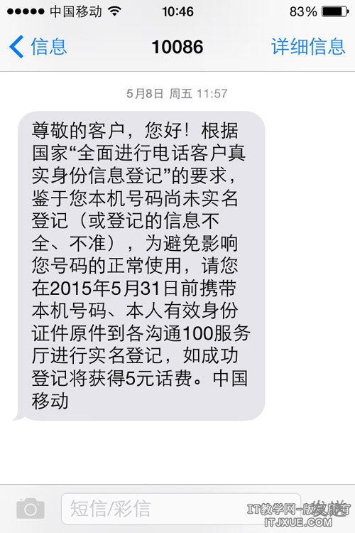 近日网络热传,未有实名制的手机用户必须在6月1日前进行实名制,否则将影响正常使用。根据微博“月光博客”收到的一条10086短信,称根据国家“全面进行电话客户真实身份登记”的要求,为避免影响号码正常使用,需要在5月31日前携带本人身份证和本机号码,到各个沟通100营业厅进行实名登记,如成功登记还将获得5元话费奖励。