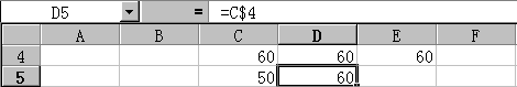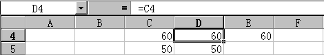 在一个工作表中,在C4、C5中的数据分别是60、50。如果在D4单元格中输入“=C4”,那么将D4向下拖动到D5时,D5中的内容就变成了50,里面的公式是“=C5”,将D4向右拖动到E4,E4中的内容是60,里面的公式变成了“=D4”。