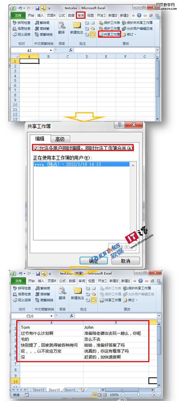 Excel也能聊天?是的!局域网用户利用Excel即可聊天又可协同工作!单击“审阅”-“共享工作薄”-“允许多用户同时编辑,同时允许工作薄合并“-”保存“-"将此Excel存放于局域网共享平台”多方即可同时输入并收到Excel上更新的内容。