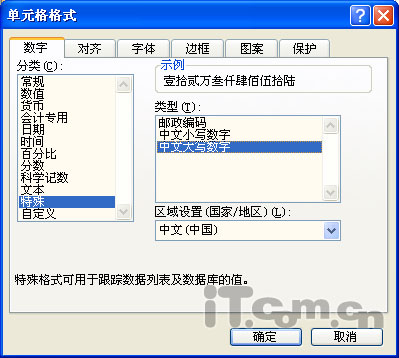 在弹出的对话框中选择“数字”选项卡,并且在“分类”列表中选择“特殊”,在类型框中选择“中文大写数字”,然后单击“确定”选中此类型即可。
