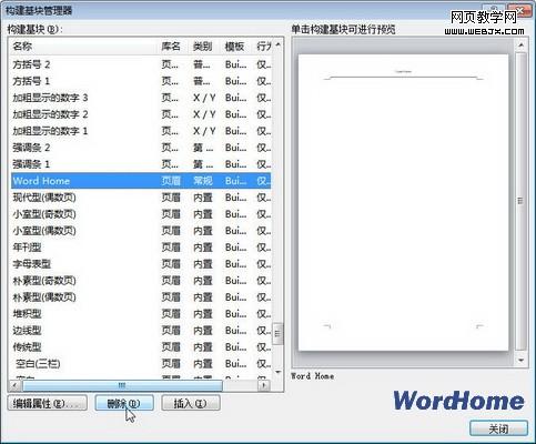 第2步:打开“构建基块管理器”对话框,单击“删除”按钮。在打开的是否确认删除对话框中单击“是”按钮,并单击“关闭”按钮即可,如图2所示。