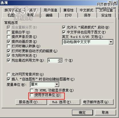 单击“工具→选项”命令,在弹出的“选项”对话框中,选择“常规”选项卡,这时我们会看到有一“度量单位”文本框,并且在栏中明显输入的计量单位是“厘米”,注意:不要被巳填好的“厘米”蒙骗了,其实在它的下面有一个打“√”的“使用字符单位”的复选项,接下来只要把这个复选项的“√”去掉,并单击“确定”按钮即可。