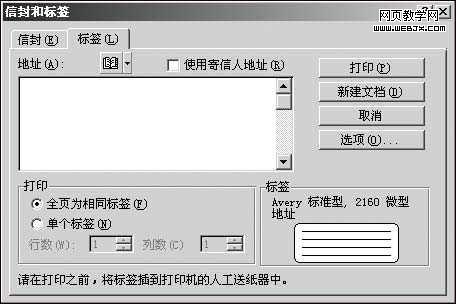 新建一个文档,依次点击“文件→页面设置”菜单项,在弹出的对话框中设置“纸型”选项卡中的“纸型”项为“自定义大小”,其中的“宽度”为19.5cm;高度为29.7cm。接着依次点击“工具→信函与标签”菜单项,在弹出的对话框中点击“标签”选项卡中的“选项”按钮(如图2所示)。