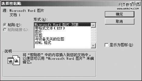 接着再返回制作单张名片时的Word文档,依次点击“编辑→复制”、“编辑→全选”。此时单张名片的状态为全选状态。操作完后切换到有十个框的文档中,单击第一行第一列的那个单元格(即左上角),依次点击“编辑→选择性粘贴”菜单项,在弹出的“选择性粘贴”对话框中选择“Microsoft Word图片对象”项(如3所示)。