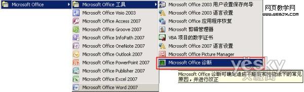 启动Office诊断工具的方法很简单。依次点击“开始—程序—Microsoft Office—Microsoft Office 工具—Microsoft Office诊断”即可。