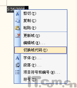 如上图所示,“显示域代码而非域值”选项将使所有域显示为域代码,而不仅仅是当前处理的域。如果只想查看当前域的域代码,可以右键单击它并选择“切换域代码”选项,如图3所示。如果选定多个域,则该命令会切换选择集里的所有域。当试图了解一些相关域的具体设置时,切换一个或多个域代码是很有用。如果熟悉域的语法,可以直接编辑域,而不必使用“域”对话框或通过其他方式(例如“插入”-“日期和时间”或“页码”)来创建域。