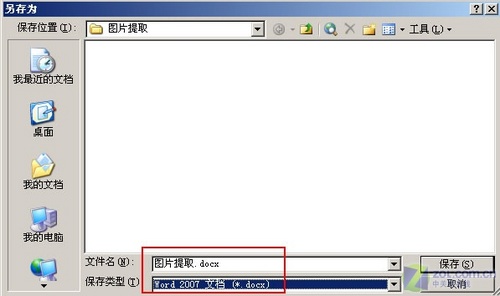 第一步:打开要提取图片的Word文档,单击“文件”→“另存为”,将文件保存类型设为“Word 2007 文档(*.docx)”格式,文件名可自定义。点击“确定”按钮生成一个*.docx格式的文件。