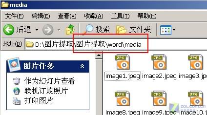 第三步:将生成的zip格式的文件解压缩,然后再在文件的解压缩目录下打开wordmedia文件夹,即可看到提取好的所有Word文档中的图片,而且是每张图片各一张,文件名也是按图片的先后顺序来命名。