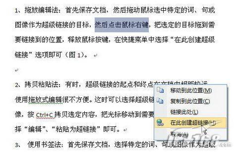 1、拖放编辑法:首先保存文档,然后拖动鼠标选中特定的词、句或图像作为超级链接的目标,然后点击鼠标右键,把选定的目标拖到需要链接到的位置,释放鼠标按键,在快捷菜单中选择“在此创建超级链接”选项即可(图1)。