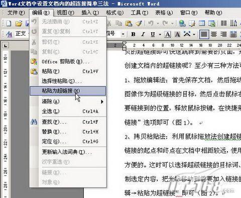 2、拷贝粘贴法:利用鼠标拖放法创建超链接很方便,但是有时超级链接的起点和终点在文档中相距较远,使用拖放式编辑的方法是很不方便的。这时可以选择超级链接的目标词、句或图像,按下Ctrl+C复制选定内容,把光标移动到需要加入链接的位置,然后执行菜单“编辑→粘贴为超链接”即可(图2)。
