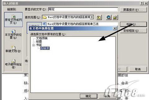 3、 使用书签法:除了以上两种方法以外,我们也可以通过使用书签来实现。首先保存文档,选择特定的词、句或图像作为超级链接的目标,选择菜单“插入→书签”,插入书签时,需要为书签命名,命名后单击“添加”按钮,把光标移到需要添加超级链接的位置,选择“插入→超级链接”,在“编辑超链接”对话框中单击“书签”按钮,并在“在文档中选择位置”对话框中选择特定的书签,单击“确定”按钮即可(图3)。