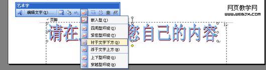 三、设置艺术字的版式:这个很重要,选择衬于文字下方。