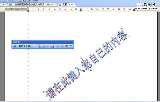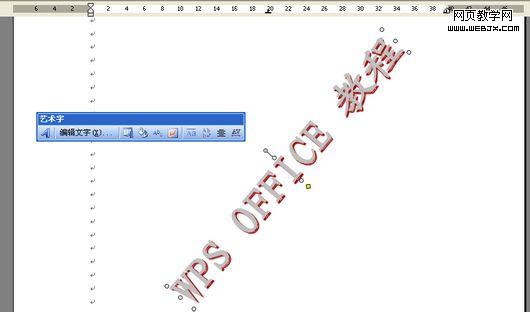 当设置的版式后,该艺术字就可以在文档中的任意位置拖动了。我们将其拖动到页面的中央部分,同时使其旋转。效果如下图所示。