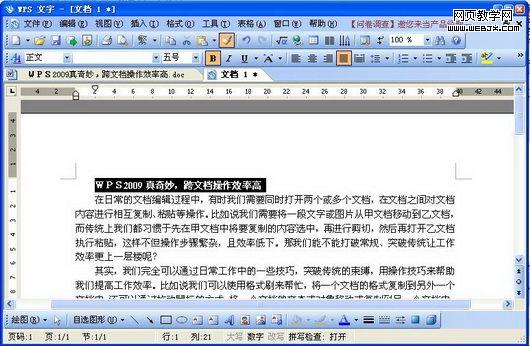 文档的移动操作也是我们日常操作的最为常用的技能之一,如果是在同一文档中进行,直接拖动就行。而如果要是跨文档移动,传统上我们都是先将要移动的内容选中,然后右击鼠标,再执行“剪切”,之后切换到另一文档,再执行“粘贴”。而在WPS 2009中就不用这麻烦了,只要用鼠标指向选中要移动的文档内容,并按下鼠标,将其拖动相应的文档标签上,待文档打开后,将鼠标移动到目的地,松开鼠标,即可完成文档内容的移动操作。
