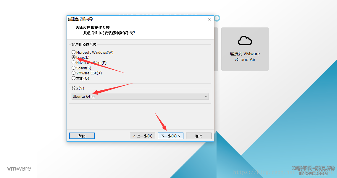 2.4 客户机操作系统 选择 Linux,版本 Ubuntu 64位(因为下载的是64位的系统,如果是 32位的,选择 Ubuntu)