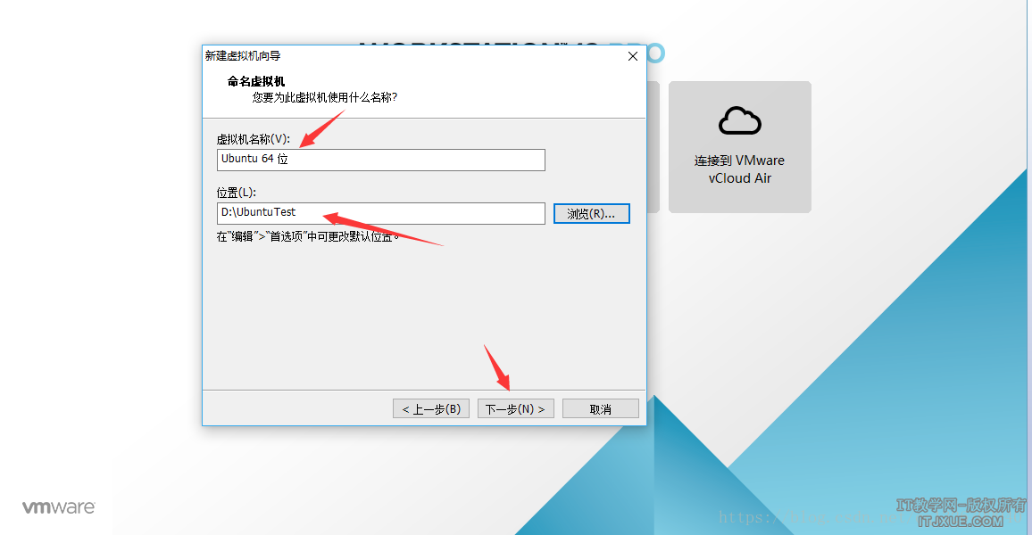 2.5)输入 虚拟机名称 和 安装位置,然后 点击 下一步