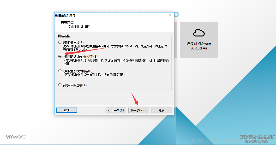 2.8)网络类型 连接方式选择 使用网络地址转换(NAT),然后 点击 下一步