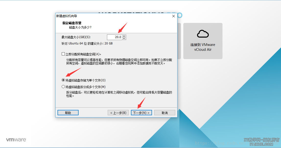 2.12)为虚拟机分配磁盘大小,按照个人电脑配置选择,然后选择 将虚拟磁盘存储为单个文件,然后 点击 下一步
