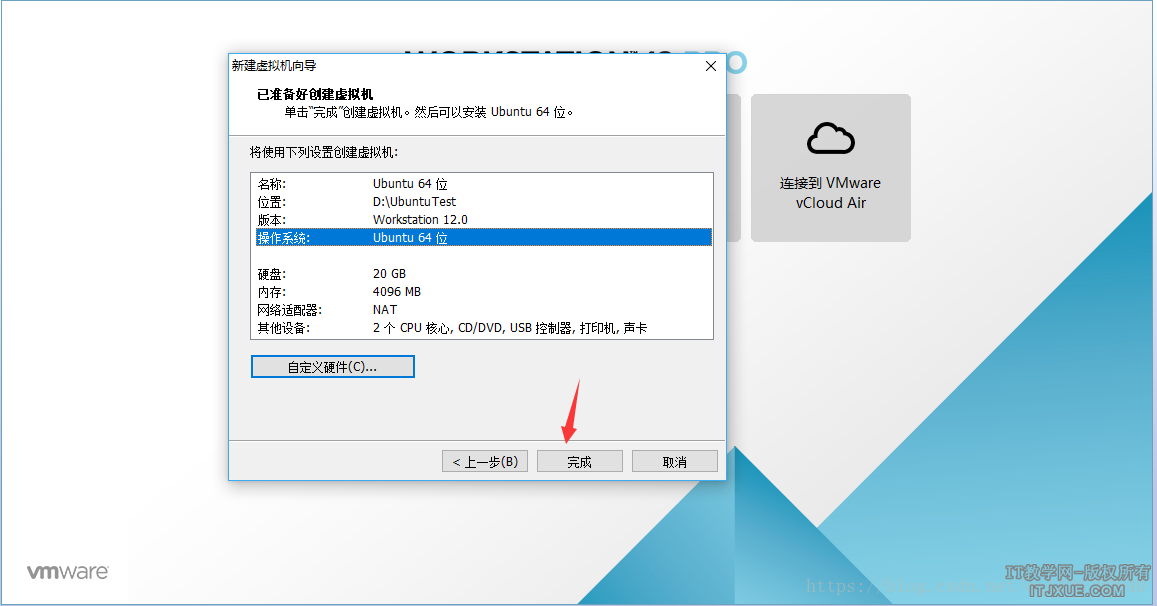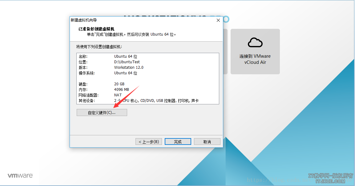 2.14)这里 点击 自定义硬件 按钮,因为在步骤2.3的时候 选择安装来源 的时候,我们选择了 稍后安装操作系统,所以在这里我们会选择系统镜像的路径