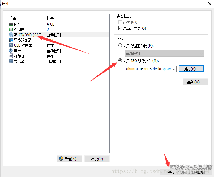 2.15)点击 新CD/DVD,在右边的 连接 部分 选择 使用 ISO 映像文件,点击 浏览 按钮 选择安装的操作系统,然后 点击 关闭 退出配置界面