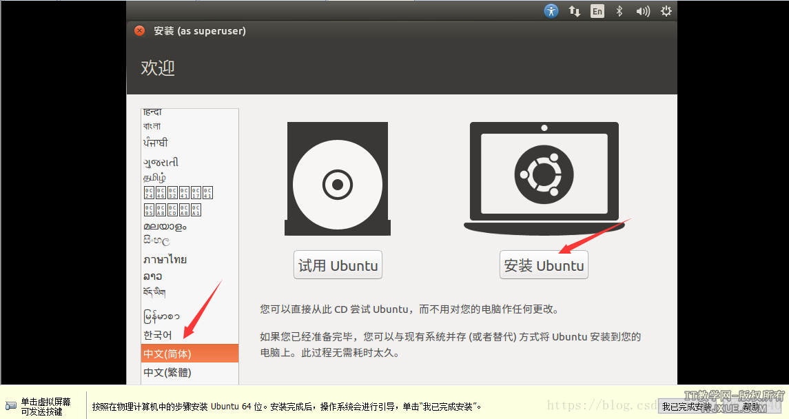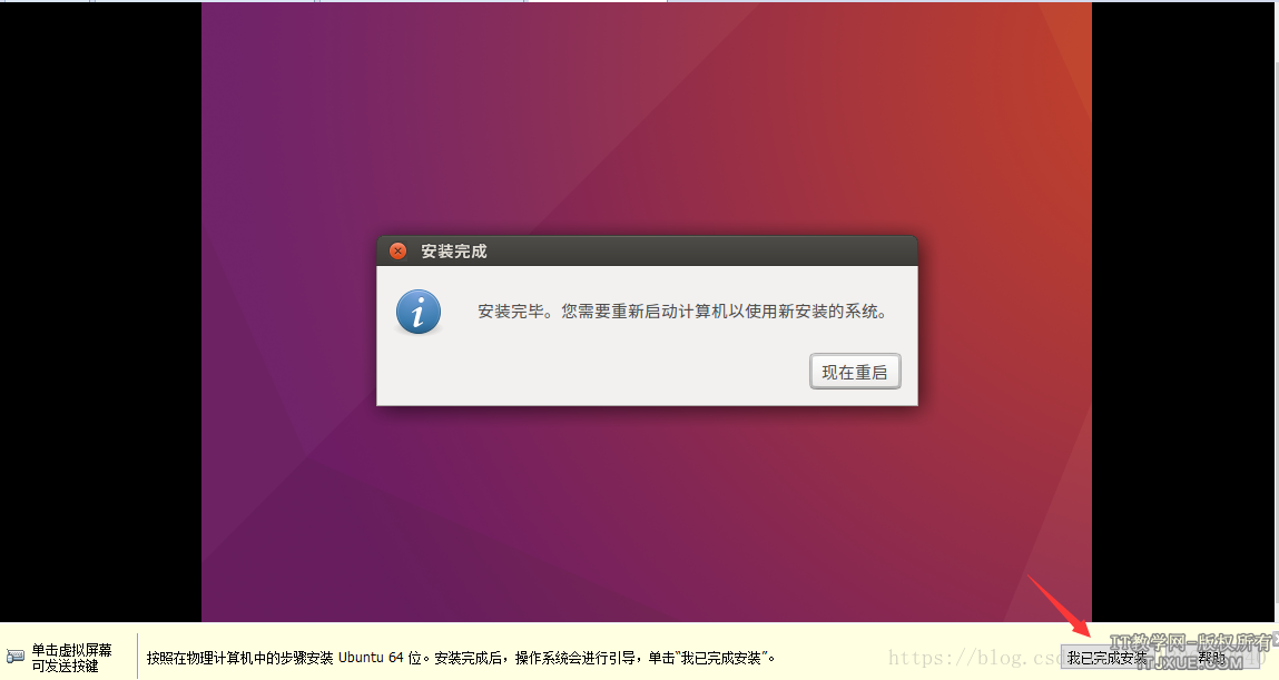 2.26)虚拟机 安装 完Ubuntu ,需要重启,先 点击 虚拟机下面 我已完成安装