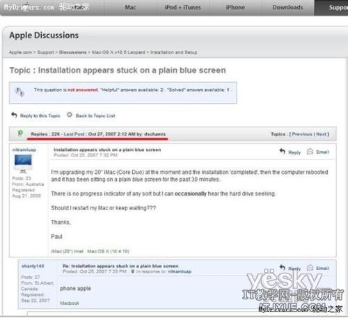 苹果 Leopard 操作系统才刚刚发布,苹果官方论坛就惊现用户报告苹果Leopard操作系统在升级安装过程中出现蓝屏卡死问题,此问题迅速引起苹果论坛网友的关注,目前该贴已经被查看8000多次,回复数已达226贴。根据回复显示,此问题并不是只有一位用户出现,还有其他用户也发现了相同问题。