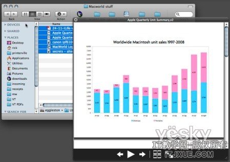 要安全地预览一个或者一组文件,而不用启动多个应用程序,我所需要做的只是,选择它们,然后按一下空格键。而且在Finder文件搜索、时间机器和Mail邮件里,以及其它一些地方,这个功能也同样有效。还有什么能如此地简单而优雅呢?我喜欢这个功能要胜过其它一切新功能。
