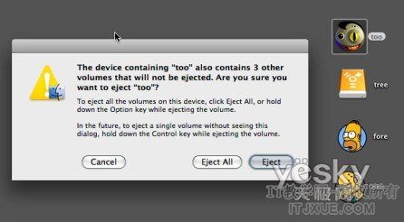 在卸载分区方面,Leopard同样也更加聪明和智能化。在过去,如果你想把台式电脑里已经过分区的硬盘中的某个卷卸载的话,Mac OS X会假定你想卸载那块硬盘上的所有分区。现在有了Leopard,你有了更多选项,是只卸载选定的卷,或者你也可以选定整块磁盘。而且,如果在卸载分区时,你一直按着Control键,它就会只卸载选定的分区,且不会弹出确认对话框。
