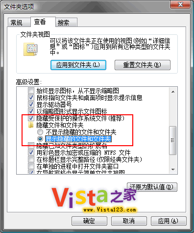 问:我在选择 工具->文件夹选项-> 选中显示隐藏文件和文件夹 选项,确定后还是看不见隐藏文件夹(没有任何错误提示)。并且再次进入工具->文件夹选项,发现 显示隐藏文件和文件夹根本没有被选中。