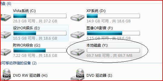 如果一切顺利的话,我们就应该能在系统中看到新的虚拟硬盘。打开“计算机”,我们就可以看到“本地磁盘(Y:)”。