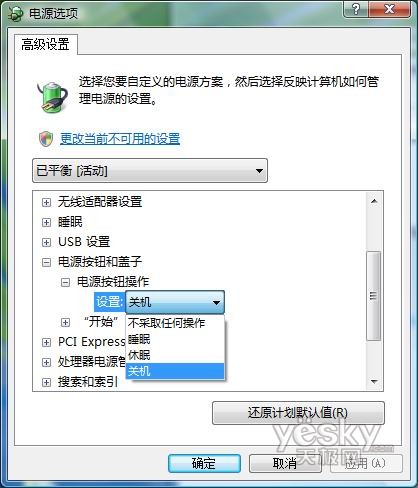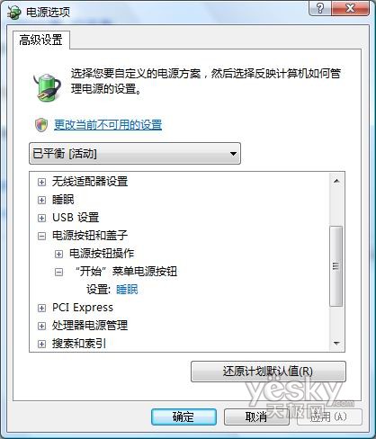 继续单击“更改高级电源设置”链接,便会进入更改“开始”菜单电源按钮属性的页面。