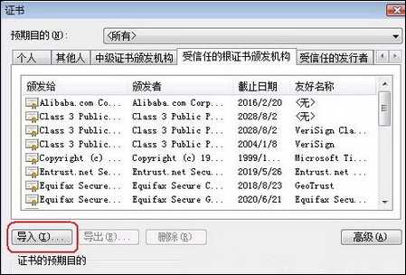 3、在要安装的证书类型时点“受信任的根证书颁发机构”,接下来点左下角的“导入”按钮导入相关的证书即可。