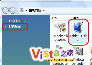 1、打开Vista控制面板,如果是在经典视图中,则双击“Tablet PC设置”图标,如果是默认视图,则点击“硬件和声音->Tablet PC设置”,打开设置窗口。如图: