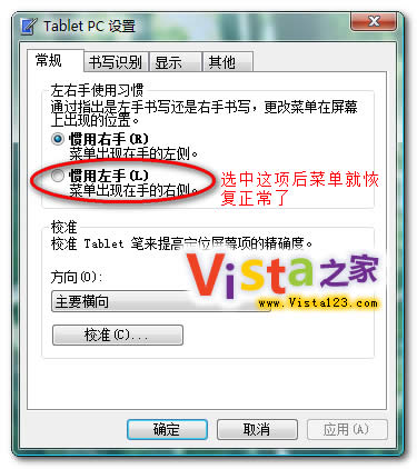 其实故障是用户自己改出来的,因为打开这个窗口后,发现默认是“惯用左手”,可一想自己一直是用右手呀,就给改成了“惯用右手”,改完后就再没发现这个菜单的问题,希望同样遇到这个问题的朋友能够借鉴一下。