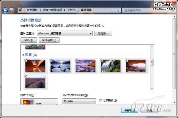 主题风格选择后,我们还可以对该主题进行设置,单击主题列表下面的“桌面背景幻灯片”,打开幻灯片设置对话框(如图2),在此程序显示了当前主题中附带壁纸,在此我们可以选择自己喜欢的壁纸。单击“图片位置 ”列表中我们可以选择自己喜欢的壁纸添加到幻灯片显示中。