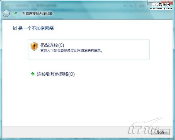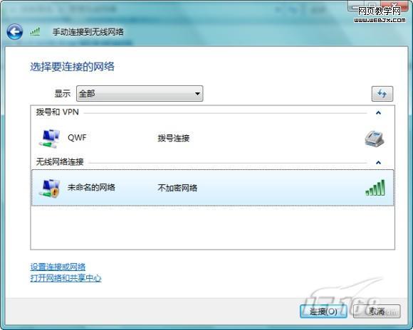 点击“添加位于此计算机范围内的网络”按钮;然后就会出现一个“手动连接到无线网络”的窗口,选择“无线网络连接”下的“未命名的网络”,点击“连接”按钮(如图3);