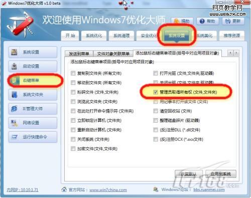 这里说的优化工具有很多种,一般支持WindowsVista的优化工具,都能用来优化WIndows7,比如Vista优化大师(进入下载),Vista总管(进入 下载)等,当然那些专门设计给Windows7的优化软件也可以达到一样的效果,比如Windows7优化大师(进入下载)、Windows7总管等等。这些工具中的系统设置中,右键设置都有 添加获得管理员权限的功能,这里就不详细说明了,大家自己找一下即可。