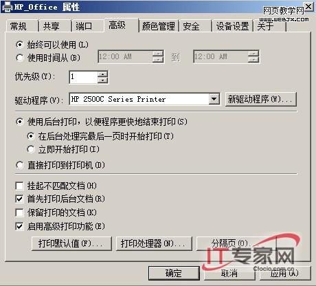 (2).检测打印管理配置。在打印管理控制台中用鼠标右键单击打印机,选择“属性”打开打印机的属性对话框,然后切换到“高级”选项卡中选中“在后台打印完最后一页时开始打印”选项,以确保将完整的文档内容传送到打印机之后再打印。(图5)