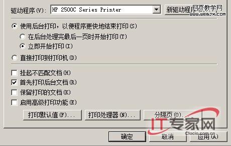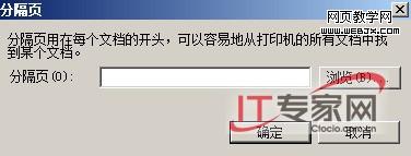 (3).检查分割页设置。在打印机属性的“高级”选项卡下,单击“分割页”按钮,然后我们可以尝试删除使用的分割页。因为当使用的分割页中使用了错误的打印页面描述语言也会导致混乱打印。(图6)