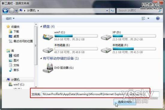 OK,没问题,我们可以通过其它方式让快速启动栏回归。任务栏空白处右键,选择“工具栏”——“新建工具栏”,然后在下方的框里输入以下路径:%UserProfile%\AppData\Roaming\Microsoft\Internet Explorer\Quick Launch