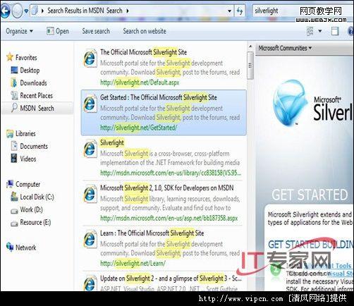 下面我们做一个演示,看看如何 手动添加一个搜索连接器。搜索连接器,大家可以去相应的站点下载或者自己手动编辑。笔者下载一个flick的是搜索连接器,其文件是flickr.osdx。打开Windows 7的资源管理器,笔者已经添加了3个搜索连接器WotNews、MSDN、Channel 9,现在我们就将bing的搜索连接器添加进来。双击bing.osdx文件,弹出对话询问能不能添加,我们点击“add”,可以看到Bing Serach已经添加进来了。我们点击该搜索连接器,然后在搜索框中输入Windows 7,可以看到系统访问bing的站点,然后搜索与Windows 7有关的内容并在右侧窗格中显示出来。点击窗口上部的“预览”按钮窗口自动分成3部分,点击中间窗格中的某一内容就会在右侧显示预览。(图5)