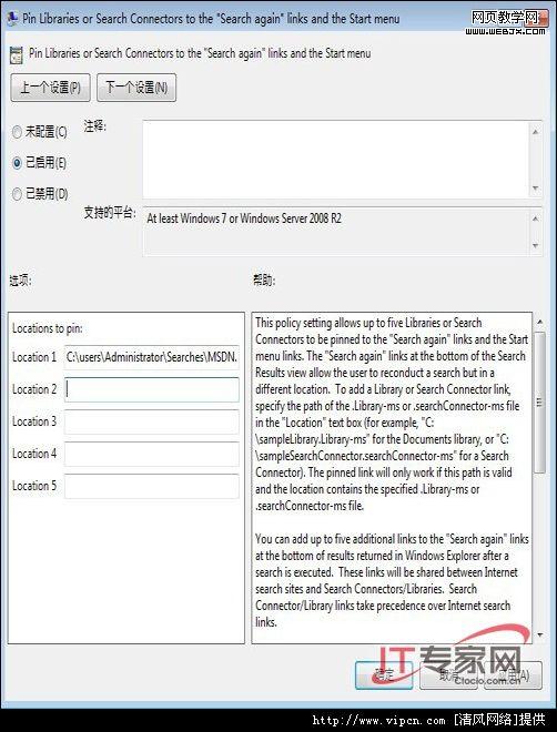 搜索连接器在系统中的揭晓,我们可以通过添加相应的注册表项来完成,当然最基本的方式是通过组策略来完成。执行“开始”→“运行”,输入gpedit.msc打开组策略编辑器,依次展开“用户配置”→“管理模板”→“Windows 组件”→“Windows资源管理器”,在右侧找到并打开“Pin Librahim or Search Connectors to the ‘Search again’links and the Shart menu”组策略项。首先选择“启用”该策略,然后在“选项”下面可以添加相应的搜索连接器执行 揭晓,在此最多只能揭晓 5个搜索连接器。将C:users用户名Searches”目录中对应的搜索连接器的完整路径复制到文本框中,例如“C:usersAdministratorSearchesMSDN.searchConnector-ms”,按照同样的要领将其它的搜索连接器执行 揭晓,这样搜索连接器就会出现在上面所示的位置中。(图7)