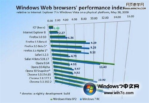 所有主流浏览器在Windows 7 RC上的运行速度均比Vista SP2上更快,并且速度大幅提高平均达到11.9%。