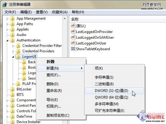 在 LogonUI 上右键,新建一个 DWORD值,命名为 ButtonSet;