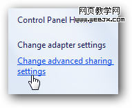 2. 在Windows 7机器上,点击控制面板 - 网络和共享中心 - 点击Change advanced sharing settings(改变高级共享设置)