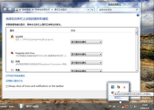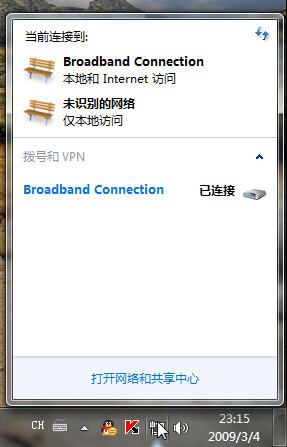 今天我们来说说Windows 7超级任务栏的右边,其实也没有什么可说的,也就是细节上的一些变化,比如说对于系统托盘的管理更加方便,而且似乎是独立出来了,而网络管理我也觉得不错,在我的印象中似乎是要比vista好的:
