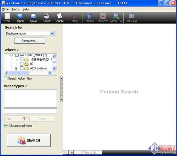 软件安装启动后,首先我们需要设定查找的范围和指定的文件类型,操作很简单,在主界面(如图1)左侧“Search for”和“Where?”这儿依次进行设置选择即可。