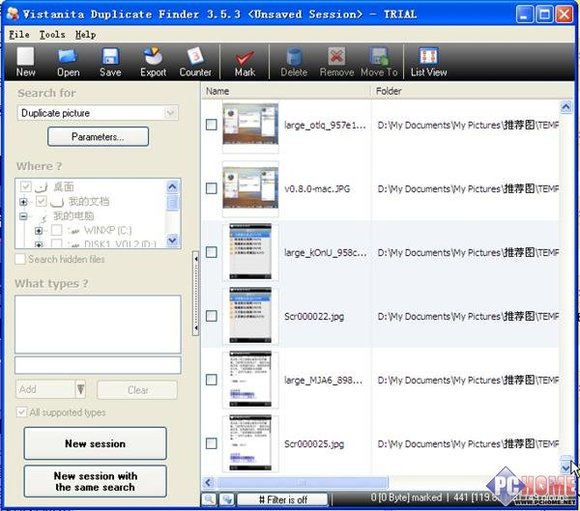 一切参数搞定之后,就可点击“Search”开始搜索工具了。整个查找过程所化费的时间根据文件的多寡而不同。搜索完成之后,软件就会在右侧列表显示(图2),对于图片文件则会显示缩略图,普通文件双击可打开。现在,你就可以进行后期的清理工作了,直接勾选不需要的文件,最后点击“ReMove”删除即可。