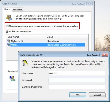 紧接着去掉“Users must enter a user name and password to use this computer”前的勾选,最后点击应用按钮就会立即弹出一个自动登录窗口(Automatically Log On)在你面前。现在将你的帐户密码信息输入其中,确认以后Windows 7系统就可以自动记住你的登录帐号,当你再次进入系统的时候,它就会自动为你登录而不需要你重新输入信息了。从此,你只需开机后坐享其成就可以啦。