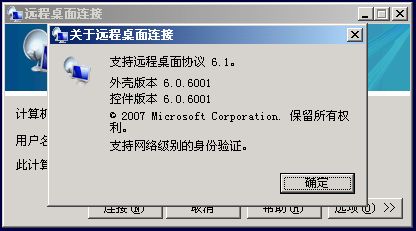 SP3有一点,就是远程桌面更新到了V6.1。查看了相关网页,了解到6.0以上版本的远程桌面是支持NLA(Network Level Authentication )的。NLA说白了就是在你进行远程桌面之前就进行身份验证,而不是你连上之后再在登陆的时候进行身份验证。而Vista 默认是“只允许运行带网络身份验证的远程计算机连接”。于是乎,我从SP3连Vista失败。